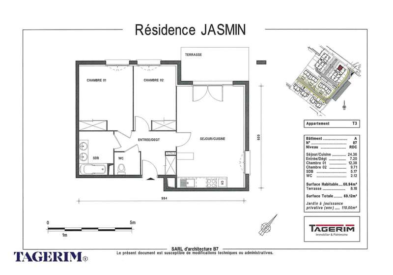 Aux portes de Toulouse, à Cugnaux, secteur pavillonnaire calme, accès rocade arc-en-ciel immédiat, à 10 minutes de la zone verte de La Ramée, transports en commun proche résidence. Apt T3 (A07) de 60.94m² situé en rez-de-jardin comprenant une entrée avec placard, cuisine équipée ouverte sur séjour, salle de bain aménagée, un WC. Terrasse de 8,18m², jardin à jouissance privative de 110m² environ, 3 places de parking : 1 sous sol, 2 extérieures.