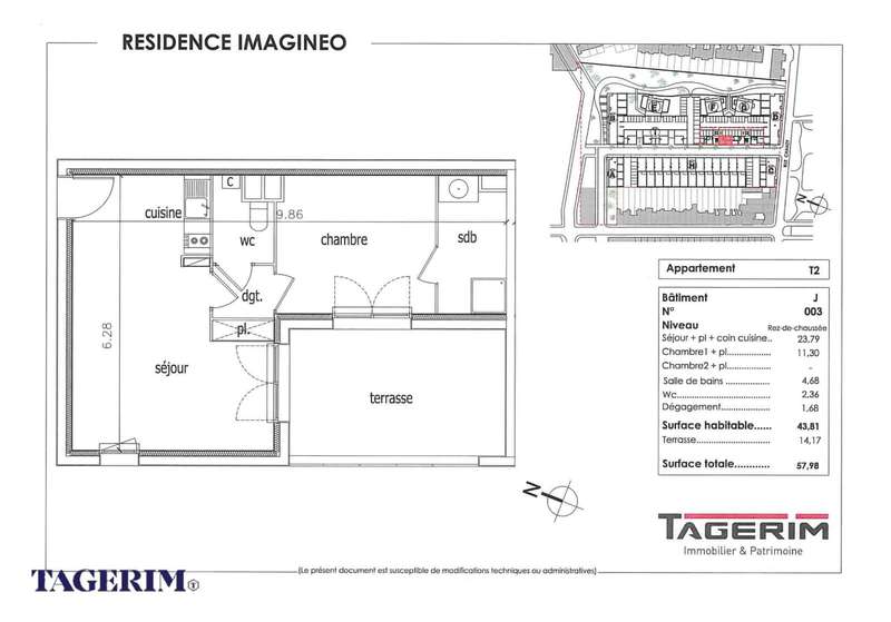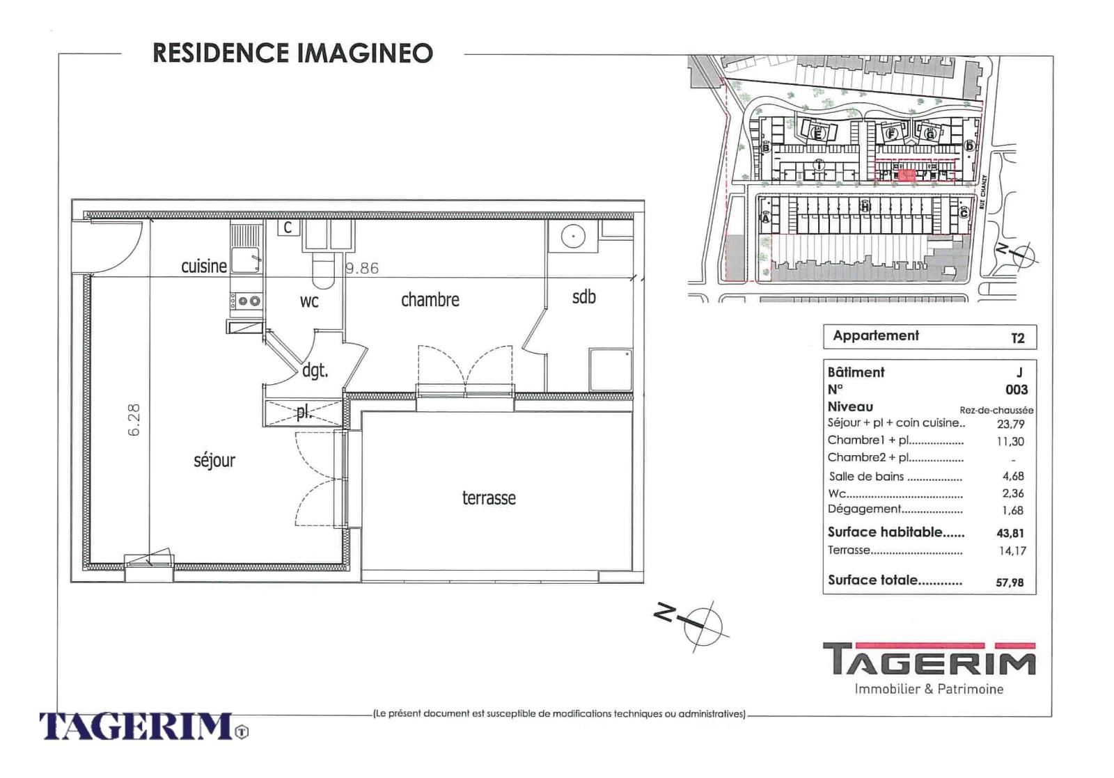Apt T2 (J003) - situé au RDC - Surface habitable de 43.81m² - Séjour + Placard + coin cuisine: 23.79m² - 1 chambre avec placard - 1 terrasse de 14.17m².