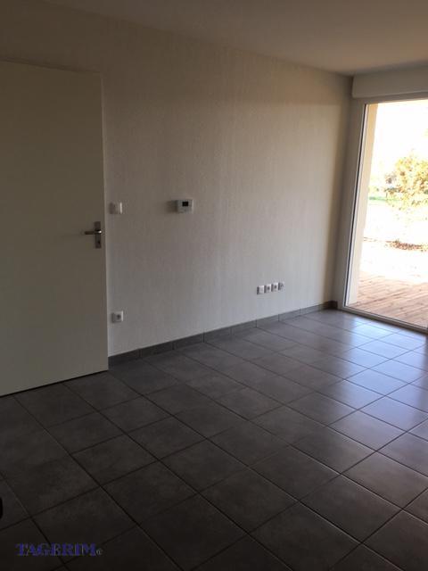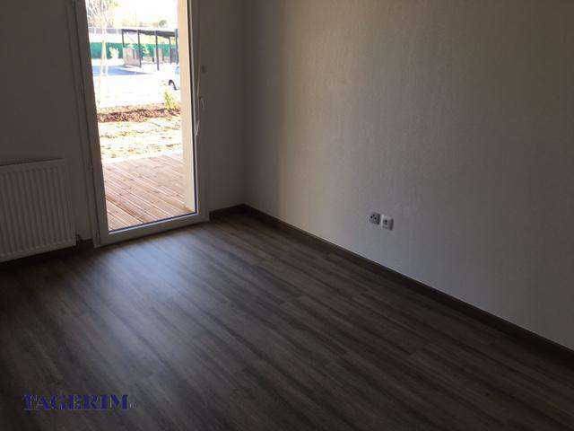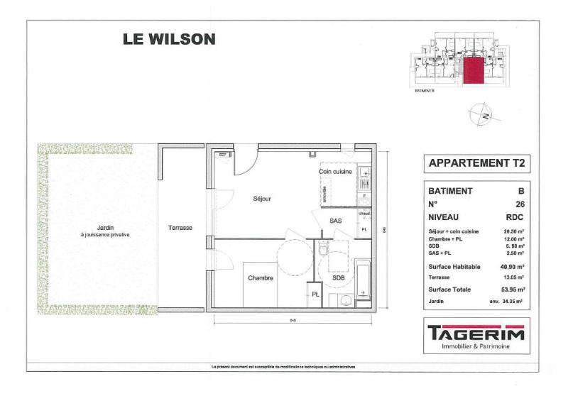 cuisine équipée, séjour donnant sur une terrasse de 13 m² et un jardin de 34 m², 1 chambre avec placard et parquet au sol, salle de bain aménagée, 1 parking aérien.