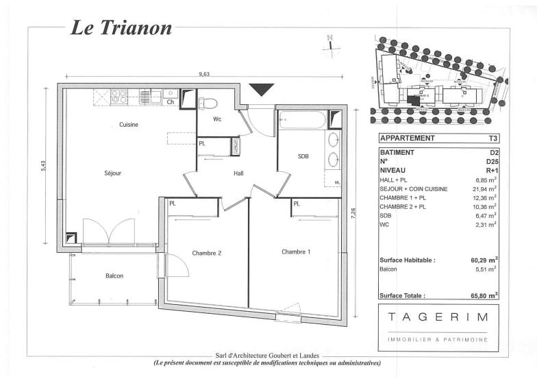 60.29 m² au 1er étage- Belles prestations, carrelage et parquet dans les chambres, cuisine équipée et aménagée, salle de bains aménagée,