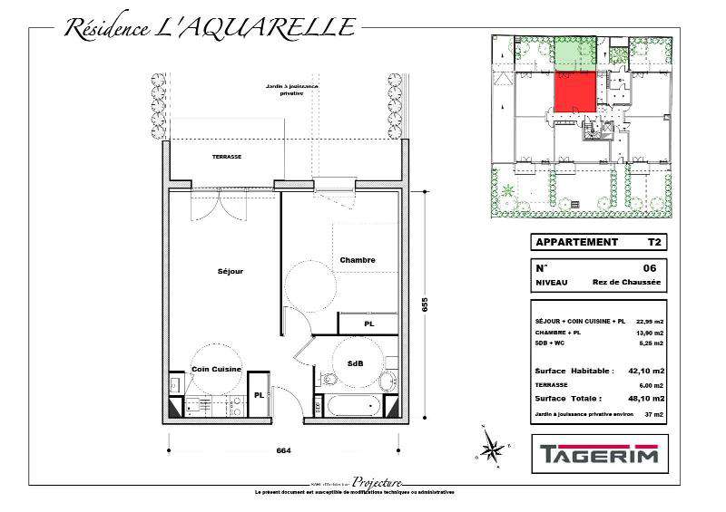 Apt T2 (06) situé au RDC - Surface habitable: 42.10m² - Séjour + coin cuisine + Pl: 22.95m² - Chambre + Pl: 13.90m² - SDB+WC: 5.25m² - Terrasse: 6.00m² sur jardin à jouissance privative d'environ 37.00m² - 1 place de parking privative en sous sol
