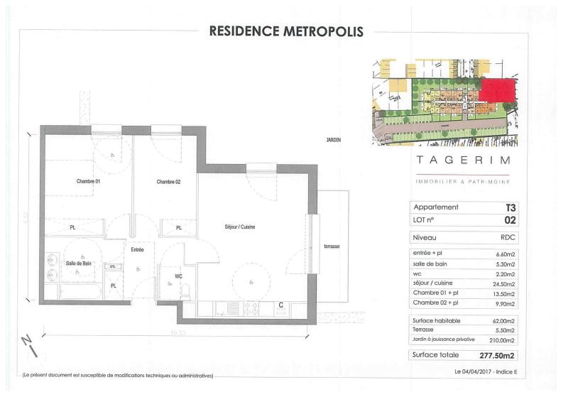 Apt T3 (02) -situé au rez de chaussée - Surface habitable: 62m² - Entrée + Pl: 6.60m² - Salle de bain: 5.30m² - WC: 2.20m² - Sejour + Cuisine: 24.50m² - chambre 01 + pl: 13.50 m² - chambre 02 + pl : 9.90m². Terrasse de 5.50m² sur jardin à jouissance privative d'environ 210.00m². Disponible le 28/04/2026. Loyer 780.00€/mois charges comprises dont 95.00€ de provisions pour charges soumises à régularisation annuelle entretien jardin compris.