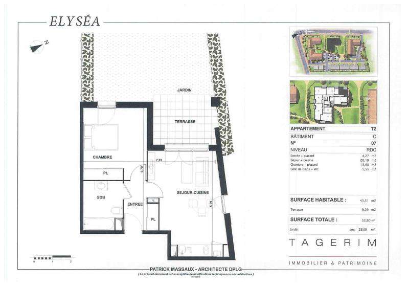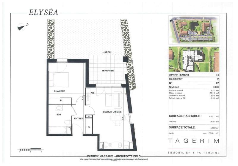 Apt T2 (C07) au rez de chaussée - Surface habitable: 43.51m² - Entrée + Pl: 4.27m² - Chambre + Pl: 13.50m² - Salle de bains + WC: 5.55m². Terrasse: 9.29m²