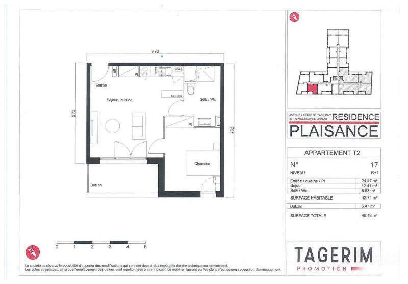 d'une superficie de 42.71m² - Cuisine équipée, ouverte sur séjour - Chambre avec placard aménagé - Balcon: 6.47m². 2 Places de parking privatives en sous sol.
