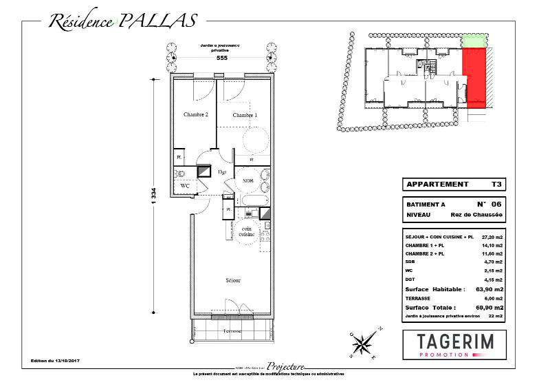 situé au rez de chaussée, d'une superficie de 63.90m², il dispose d'une terrasse de 6.00m² sur un jardin à jouissance privative d'environ 22.00m², la cuisine équipée est ouverte sur le séjour, salle de bain aménagée, WC séparé et 2 chambres avec placards aménagés.