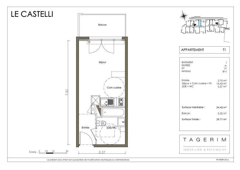 UN APPARTEMENT Apt T1 lot 17 n°1A17 du plan - Bat 1 - Entrée A - 1er étage - Surface habitable: 24.45m² - Entrée: 2.75m² - Séjour + Coin cuisine + Placard: 16.43m² - SDB + WC: 5.27m². Balcon: 5.3