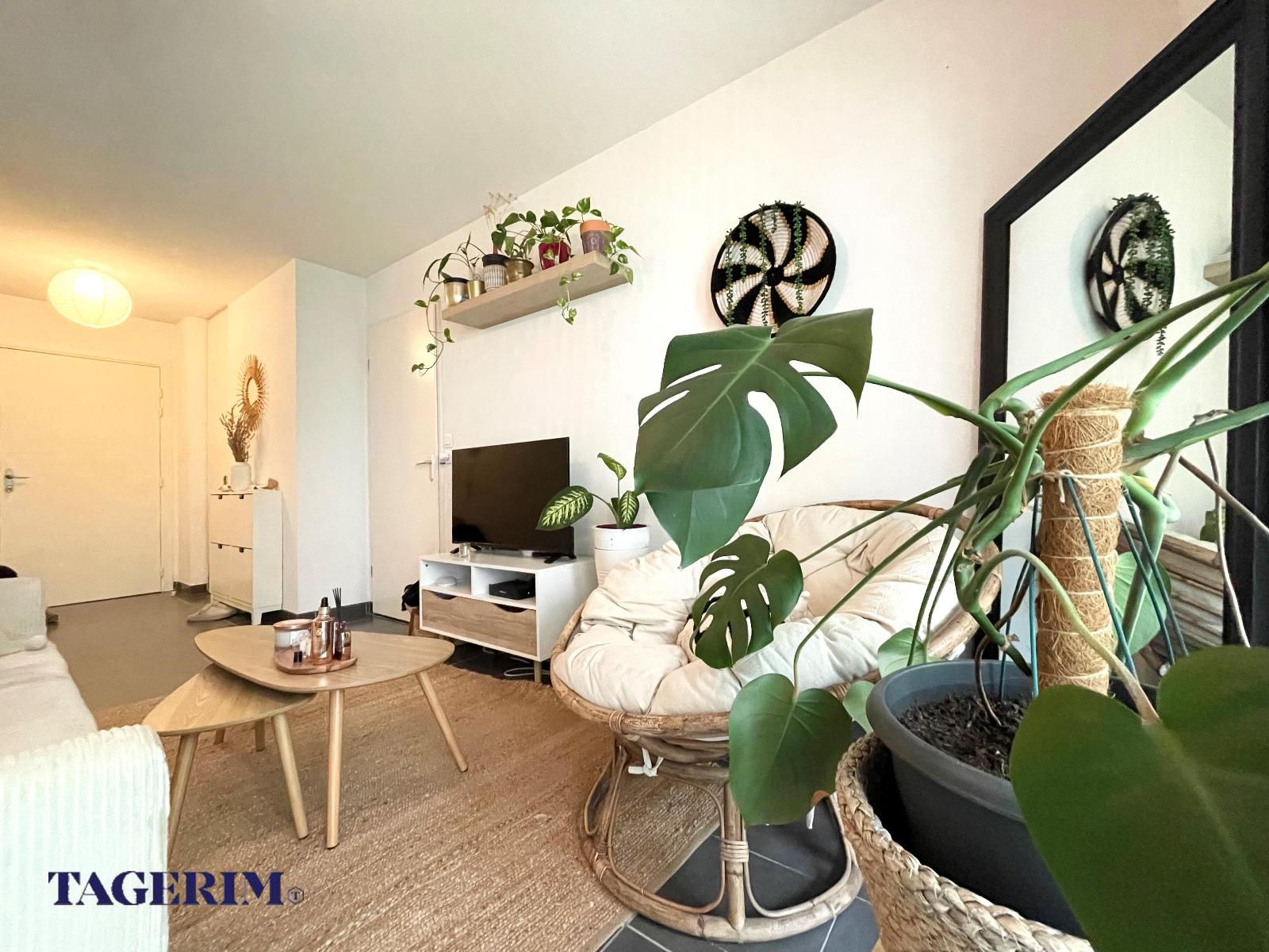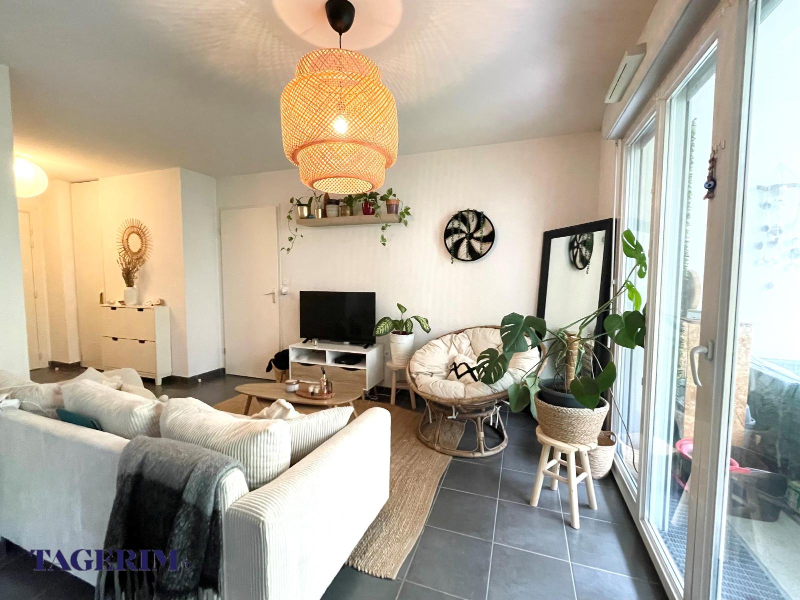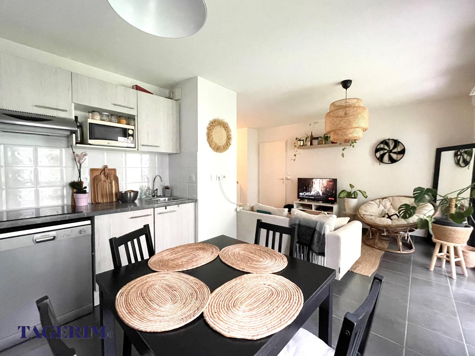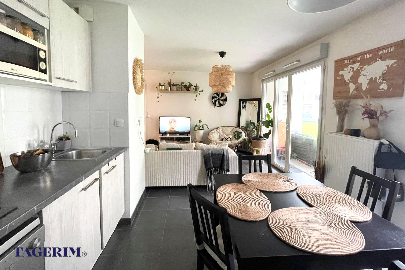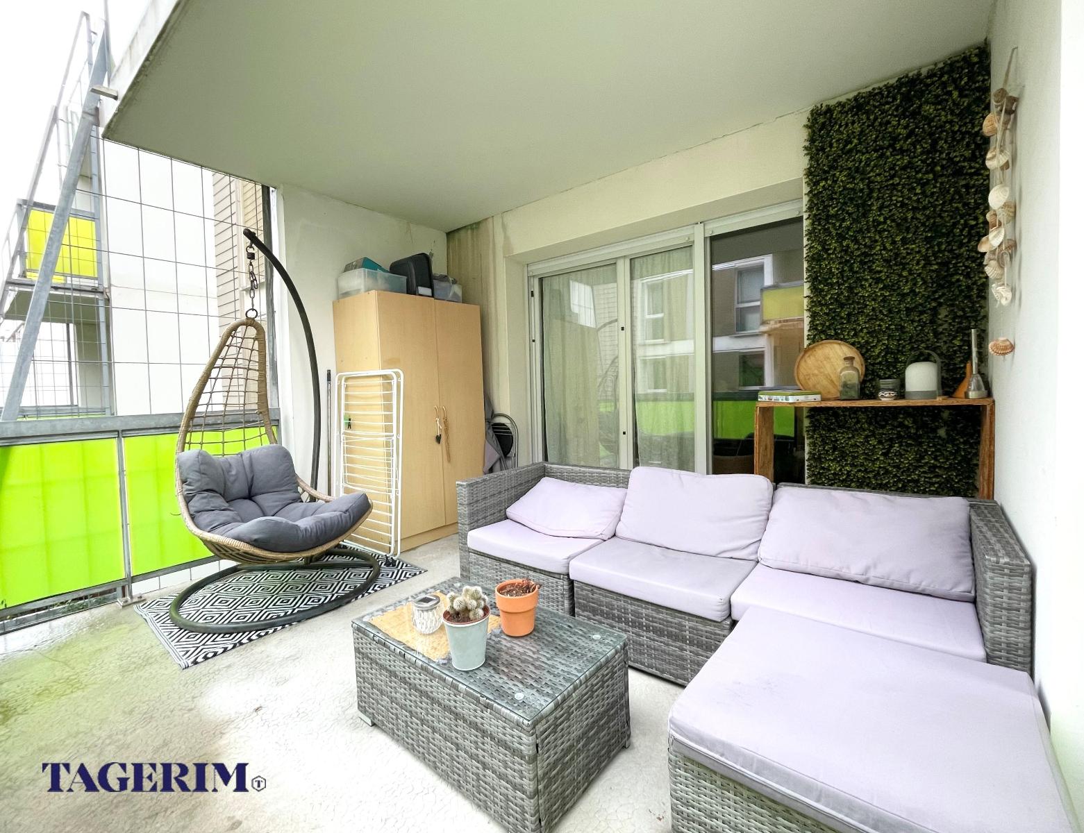 avec GRAND BALCON COUVERT de 11 m2 exposé SUD . Entrée avec placard et Pièce de vie de 25 m2 avec cuisine US.