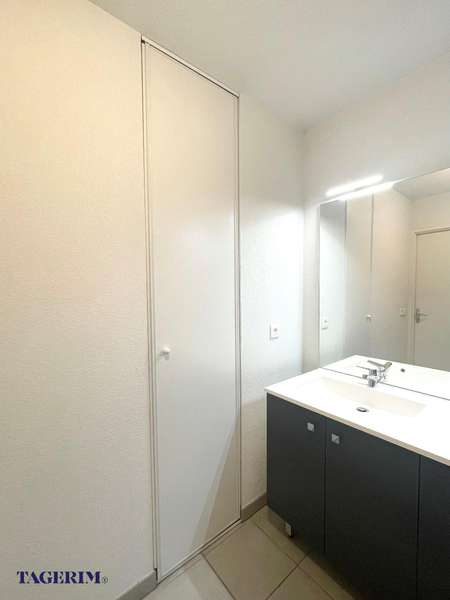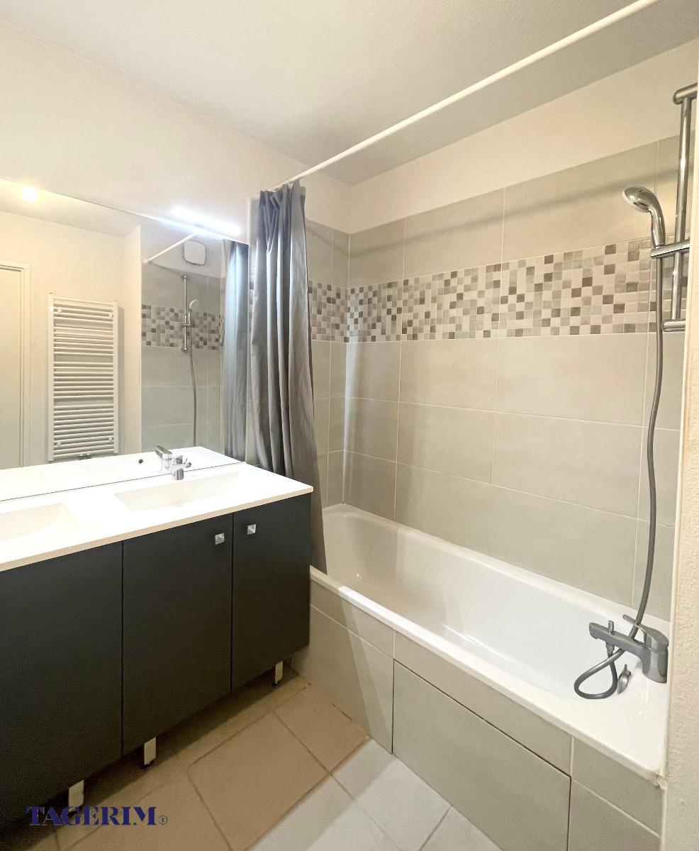 d'une Cuisine américaine aménagée et d'un Séjour. Placard à l'entrée. Deux chambres avec placard dont une grande de 13m2 env. Salle de bain avec meuble double vasque et placard. WC indépendant . Bien vendu avec